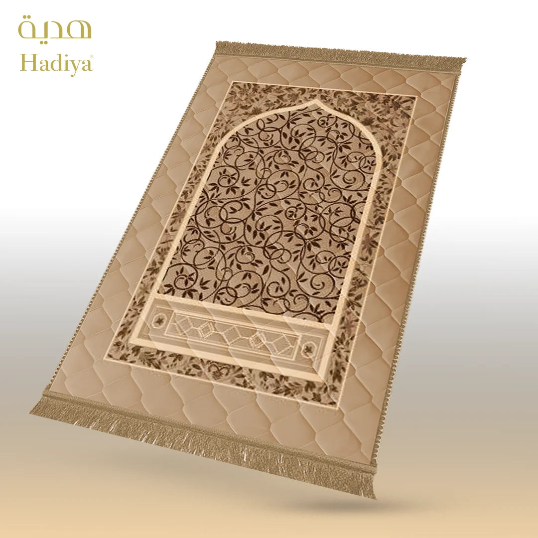 Made with soft and shiny mink fabric, this prayer mat feels smooth during sujood while providing gentle support. The 1-inch quilted padding ensures comfort without extra weight. Its waterproof back helps protect the mat on different surfaces, while the neat lace finishing adds a clean and elegant look.