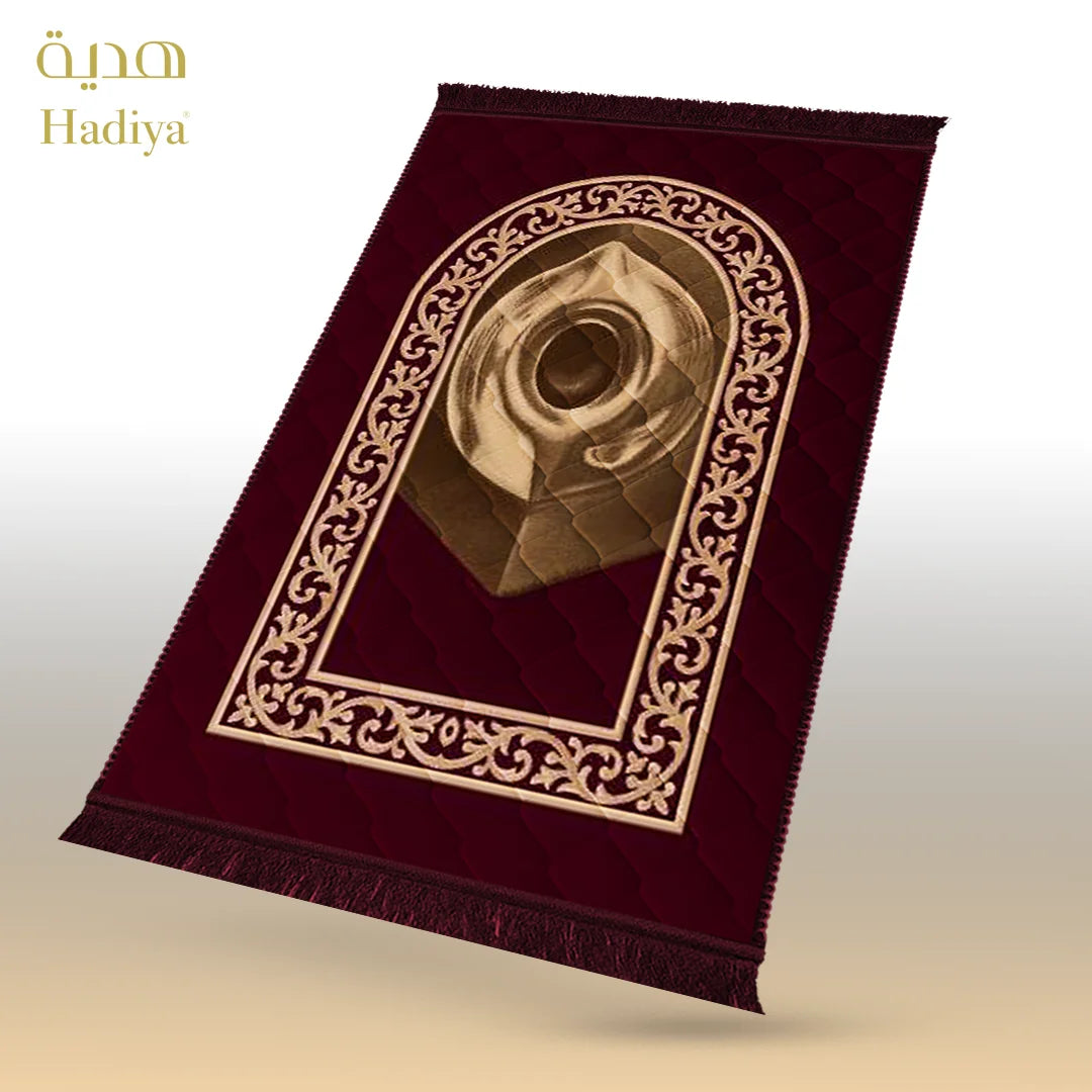 Made with soft and shiny mink fabric, this prayer mat feels smooth during sujood while providing gentle support. The 1-inch quilted padding ensures comfort without extra weight. Its waterproof back helps protect the mat on different surfaces, while the neat lace finishing adds a clean and elegant look.