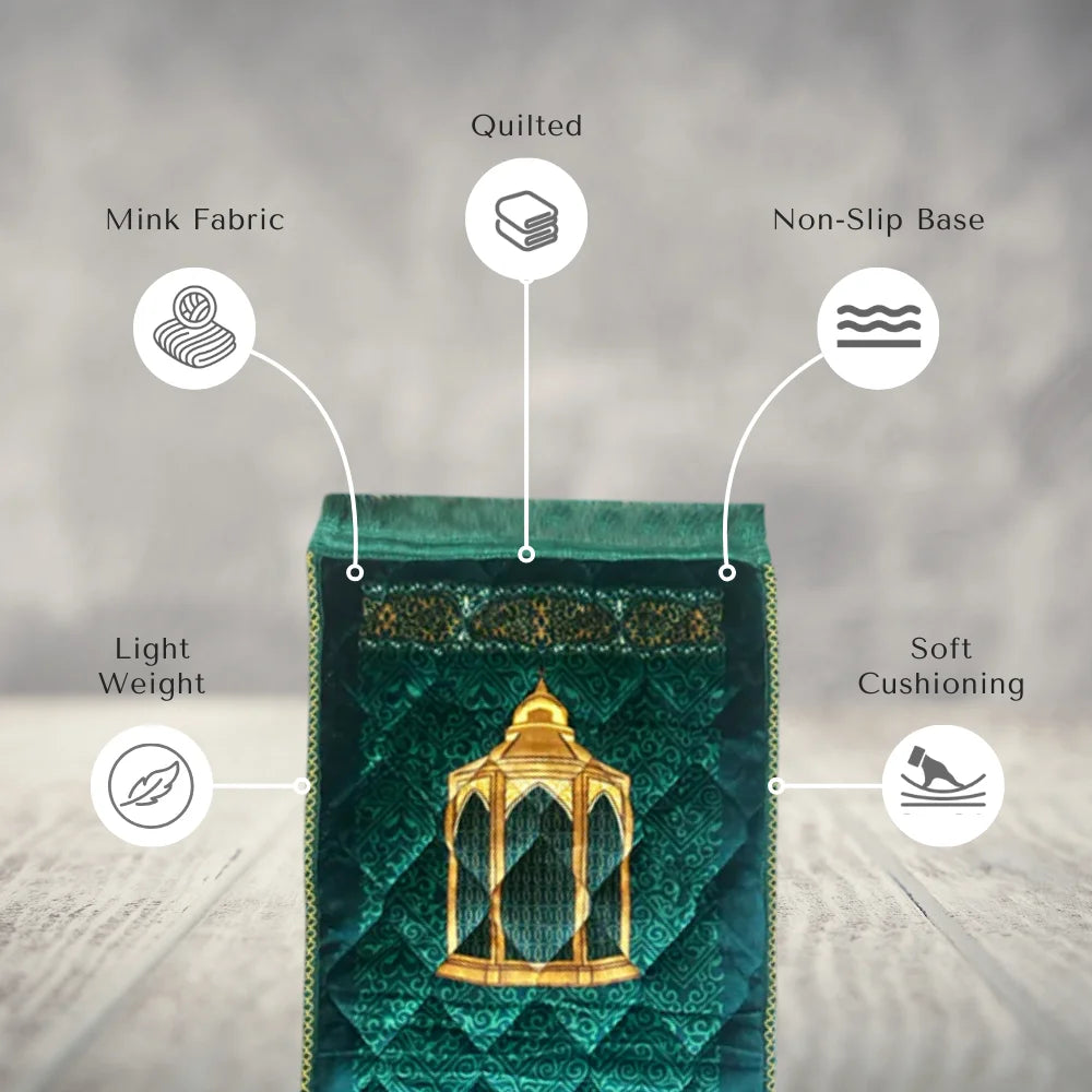 Extremely soft and fuzzy prayer mats, visually appealing Lightly padded, easily foldable and lightweight to carry. Made from premium quality suede velvet Gentle hand washing recommended