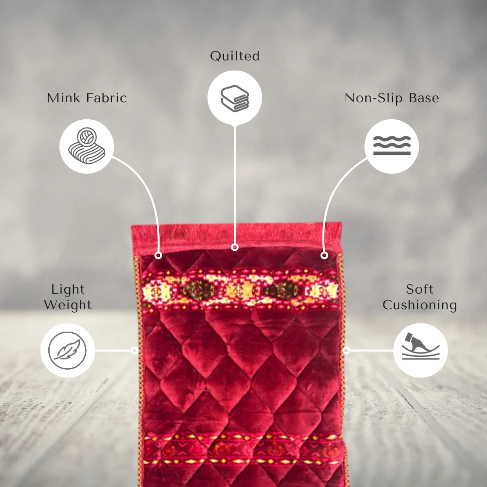 Extremely soft and fuzzy prayer mats, visually appealing Lightly padded, easily foldable and lightweight to carry. Made from premium quality suede velvet Gentle hand washing recommended
