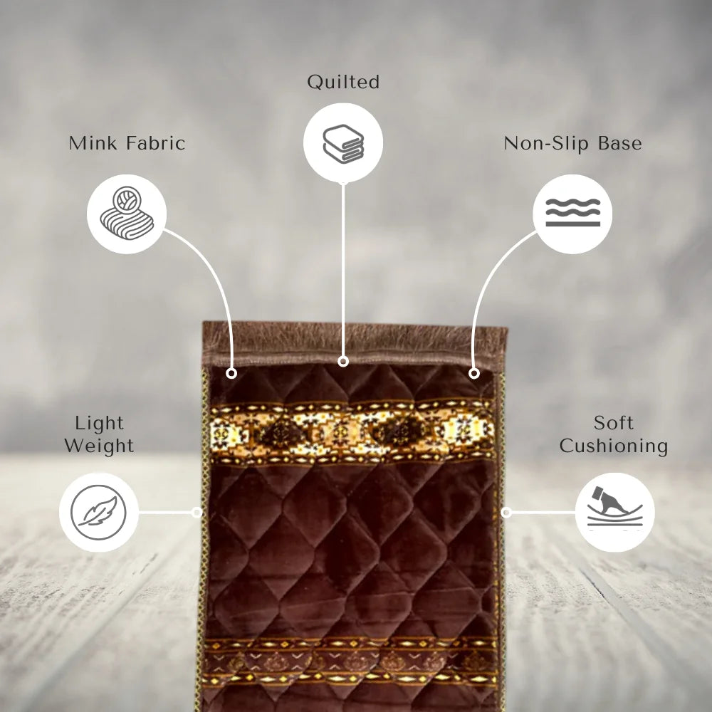 Extremely soft and fuzzy prayer mats, visually appealing Lightly padded, easily foldable and lightweight to carry. Made from premium quality suede velvet Gentle hand washing recommended