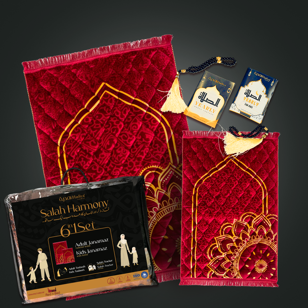 Discover Hadiya’s exclusive Salah’s first-ever complete prayer gift set, designed to bring families together in worship. Beautifully packed in a premium packaging, this set is a perfect blend of spirituality, elegance, and togetherness — created with love in Karachi by RednBed, the trusted name in luxury prayer mats.