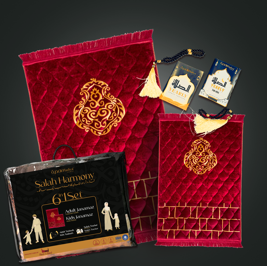 Discover Hadiya’s exclusive Salah’s first-ever complete prayer gift set, designed to bring families together in worship. Beautifully packed in a premium packaging, this set is a perfect blend of spirituality, elegance, and togetherness — created with love in Karachi by RednBed, the trusted name in luxury prayer mats.